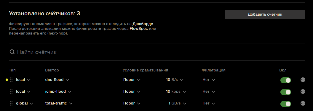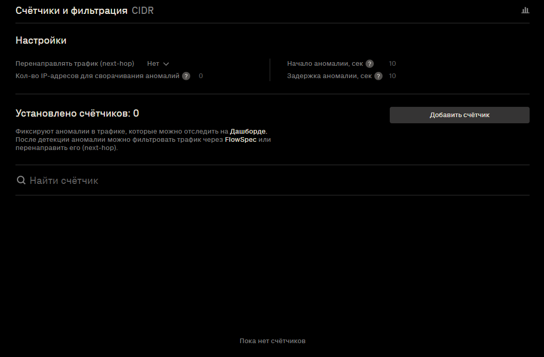 Раздел предназначен для управления счётчиками и фильтрацией зафиксированных аномалий. Данные о событиях доступны на Дашборде и могут обрабатываться через FlowSpec-правила или перенаправляться на следующий хоп (next-hop).