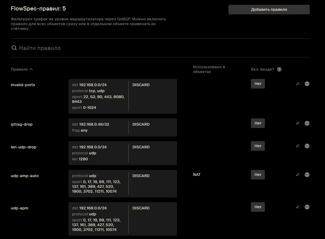 Столбец Вкл. везде? — ручная публикация анонса FlowSpec. При включении система немедленно формирует и отправляет BGP FlowSpec-анонс правила на маршрутизаторы. Пороги и счётчики объектов при этом не учитываются.